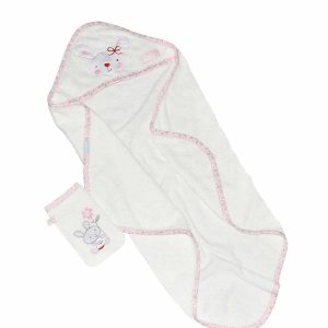 ست حوله دو تکه رز برن طرح little bunny شامل یک عدد حولهی دورپیچ کلاه دار و یک لیف است که از لوازم کاربردی برای استحمام نوزاد به حساب می آید.